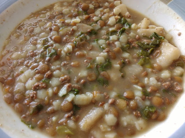 Tinha aqui em casa: lentilha, carne moída, inhame e folhas de mostarda, e foram esses os ingredientes que usei.